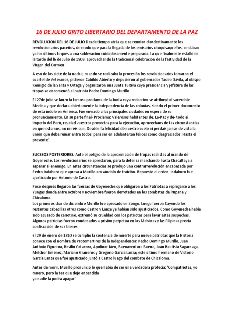 16 De Julio Revolución De La Paz - La revolución de julio fue el primer foco de un levantamiento general a favor de la independencia.